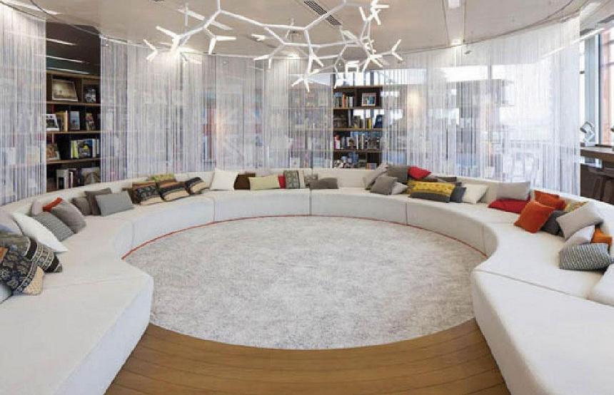 白的圓弧大沙發,靜靜的存在偌大的房間中,上頭還有著許許多多的小抱枕,在沙發身後,有著同樣是圓弧形直立至天花板高的書櫃,上面不僅擺滿了書,也擺了些照片等,窗外陽光照射進來,讓人感覺溫馨,也顯的靜謐。」上面所介紹的可不是什麼圖書館,也不是什麼高級沙龍店,這是Google公司在倫敦的辦公室之一。